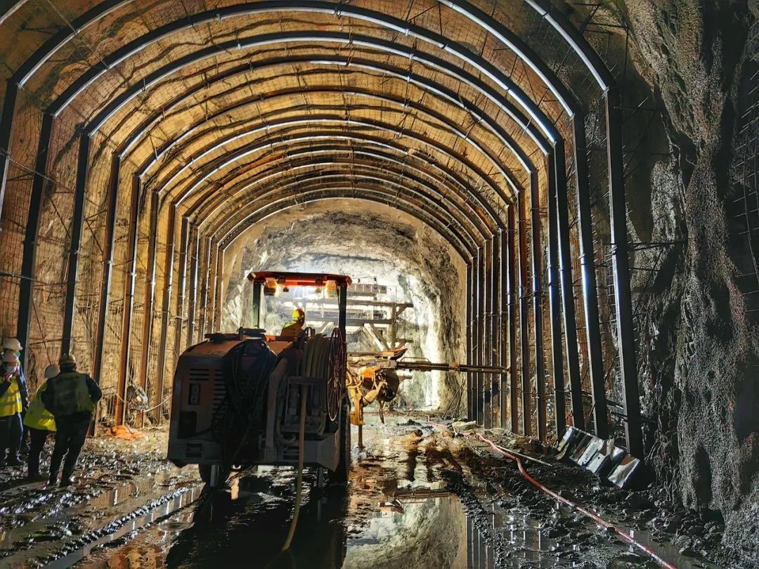 南方电网加快推进梅蓄二期、肇庆浪江、惠州中洞抽水蓄能电站建设。图为在肇庆浪江抽水蓄能电站交通洞礃子面附近处,工作人员进行锚杆钻孔施工。(李志杰 摄)